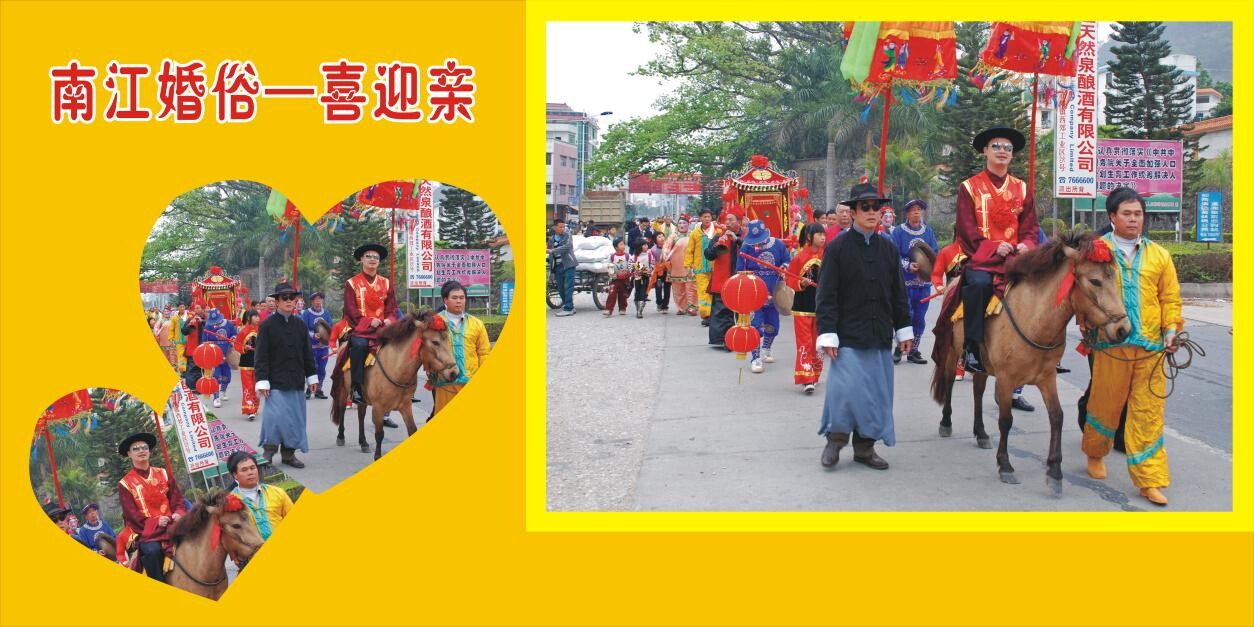 三、南江婚俗:南江婚俗,始于明末清初,这种特有的民间习俗,一直在南江流域生生不息传承着。它以轿为交通工具,以哭嫁歌为主线,在备婚宴、接新娘、拜高堂、会歌友贯穿全婚俗的全过程,具有浓郁的南江地域特点。 南江婚俗有“六礼” 环节。“六礼”一是定婚。二是担定,男家选定良辰吉日,备齐定金,礼品,以全柬书送之女家,决定婚事已“尘埃落定”。三是择日,男家择定结婚日子后,把婚期用红柬写好,备好礼品送女家,确定结婚日子。四是哭嫁。女方在出嫁前10天,是“三步不出闺门”,学会唱新娘歌。五是迎娶,这是婚俗中的重要礼仪。一大清早,新娘要按吉时辰梳头,装好面,穿好新娘服装,等男方来迎娶。六是归宁,又叫“三朝回门”。结婚后第三天早上,一对新人带备礼品探访女方娘家,至此,整个婚礼结束。