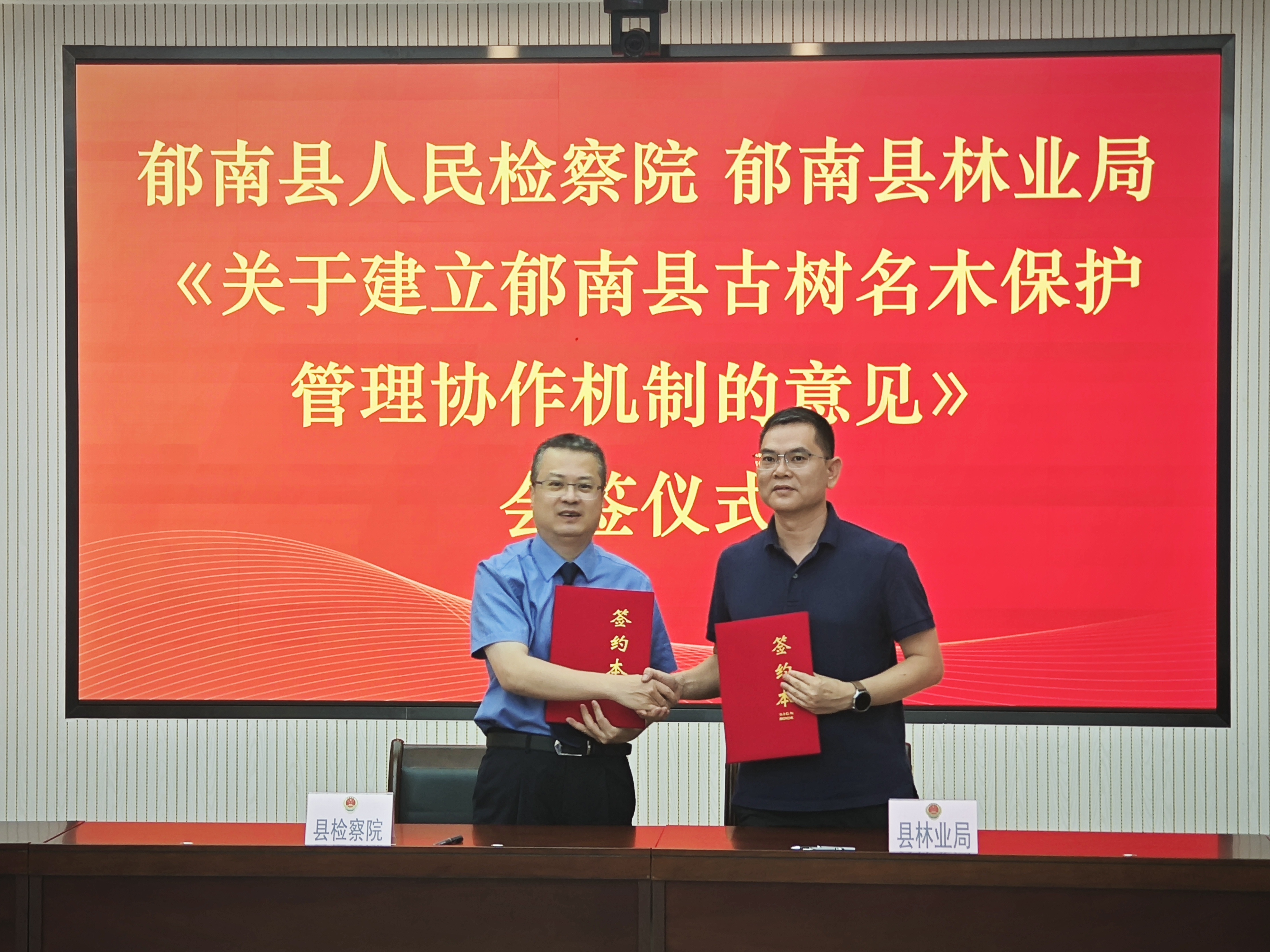 县林业局积极落实古树名木保护措施,为巩固前期保护古树名木的成果,同时落实“林长+检察长”的决策部署,充分发挥林业机关的依法监管职能和检察机关的法律监督职能,经过前期与县人民检察院的积极沟通协调,双方于当日正式签订《关于建立郁南县古树名木保护管理协作机制的意见》。该机制的建立,将古树名木保护成果以制度形式固定下来,为今后的保护工作筑牢根基,搭建起林业部门与检察机关协同合作的桥梁。县林业局将以此为契机,持续深化与县人民检察院等相关部门的协作联动,全力保障古树名木保护管理协作机制高效运转,携手守护郁南的绿色财富,助力推动郁南生态文明建设迈向新高度。