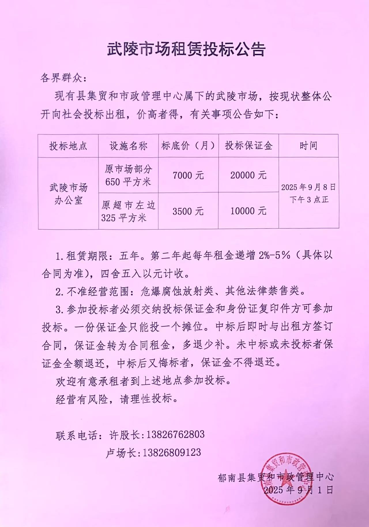 现有县集贸和市政管理中心属下的武陵市场,按现状整体公开向社会投标出租,价高者得,有关事项公告如下: