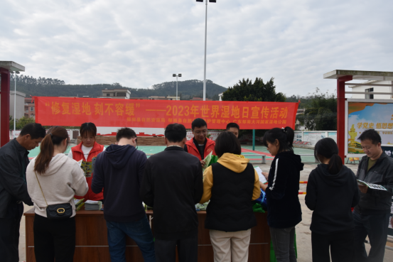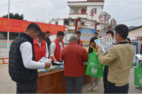 活动现场,志愿者们先到湿地公园开展植树活动,有的扶正树苗,有的挥锹培土,有的夯实浇水,各个环节衔接有序,忙得不亦乐乎,种下一颗颗春天的希望,也为湿地修复工作增添一抹抹绿色的未来;随后到万洞村委文化广场开展宣传活动,通过悬挂横幅、摆放湿地展示牌、发放宣传手册和湿地保护倡议书的形式,向群众宣传湿地知识、野生动植物保护以及《中华人民共和国湿地保护法》等,增强湿地公园周边村民乃至社会各界群众保护湿地、遵守湿地法律法规的自觉性和积极性。