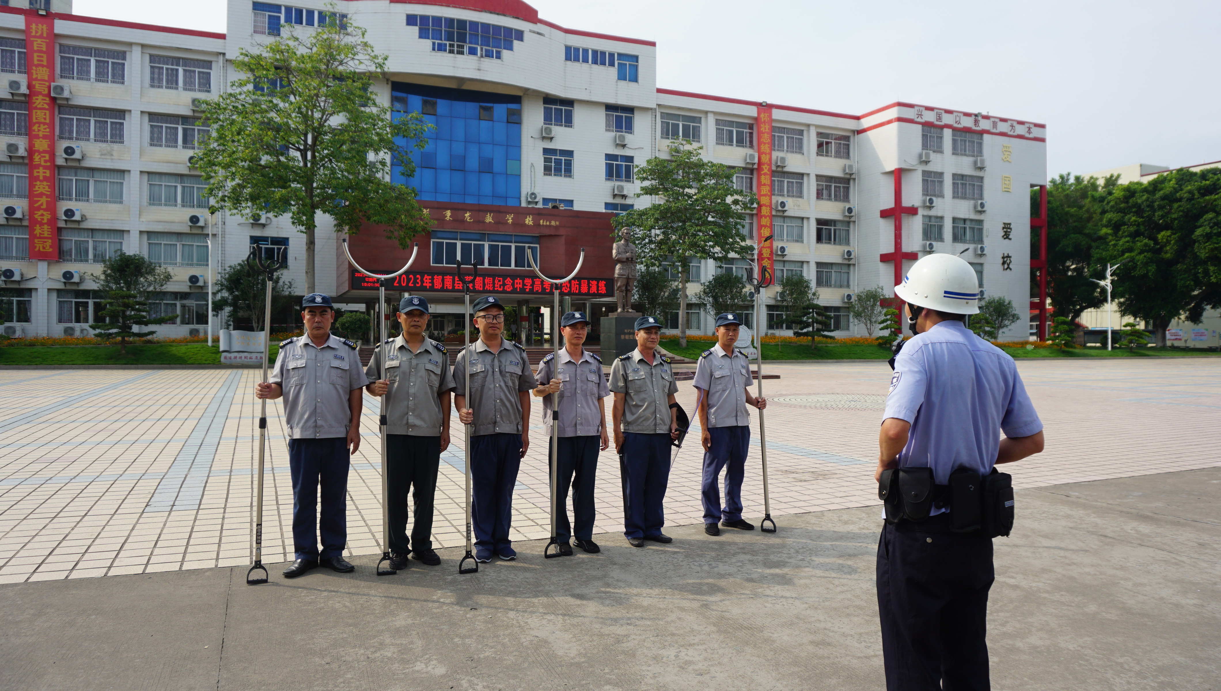 2023年高考将至,为了切实做好高考考试组织工作,确保工作万无一失,实现“健康、平安、公平、诚信、暖心”高考五大目标。6月1日下午,蔡朝焜纪念中学举行了2023年高三考生高考进场暨防恐、防暴应急疏散演练活动。 活动开始前,学校成立了工作领导小组,精心策划,认真组织,扎实开展演练活动,确保了演练活动顺利进行。 首先进行的是防恐、防暴应急疏散演练活动。为确保演练效果,学校邀请了郁南县都城镇城北派出所领导、民警到场指导培训,学校护校队全体队员参加了本次演练。 在演练中,城北派出所警官现场讲解了校园反恐防暴技能理论,并现场演示了盾牌、警棍、钢叉等安全防暴器材的使用方法和技巧。 现场模拟训练。由派出所警官扮演手持凶器企图闯入校园的“歹徒”,一名护校队队员迅速报警,其余队员使用盾牌、警棍、钢叉等器材阻止“歹徒”进入校园。接到报警后,城北派出所警官迅速到场,并果断、坚决、迅速地将“歹徒”控制住。 我校按照2023年普通高考模拟演练工作要求,进一步规范考场管理,把好考生入口关,首次在考点使用“智能安检门”设备,规范人员入场安检工作,从源头杜绝电子设备进入考点考场。 演练中,考生均在“考点”入口处先接受人工手持金属探测仪安检,无异常情况后进入“智能安检门”,无报警声响方可进入考点;若出现异常报警则再次接受人工手持金属探测仪安检并再次通过安检门,无异常报警,且无其他违禁物品方可进入“考场”参加考试。 本次演练活动,不仅进增强了学校安保人员的反恐意识和处置突发事件的能力,提高了安保人员的应急处置技巧,还进一步增强了学生诚信参考意识,能有效帮助师生熟悉安检流程和要求,为确保2023年高考考生人身安全、高考安全平稳顺利进行奠定了坚实基础。