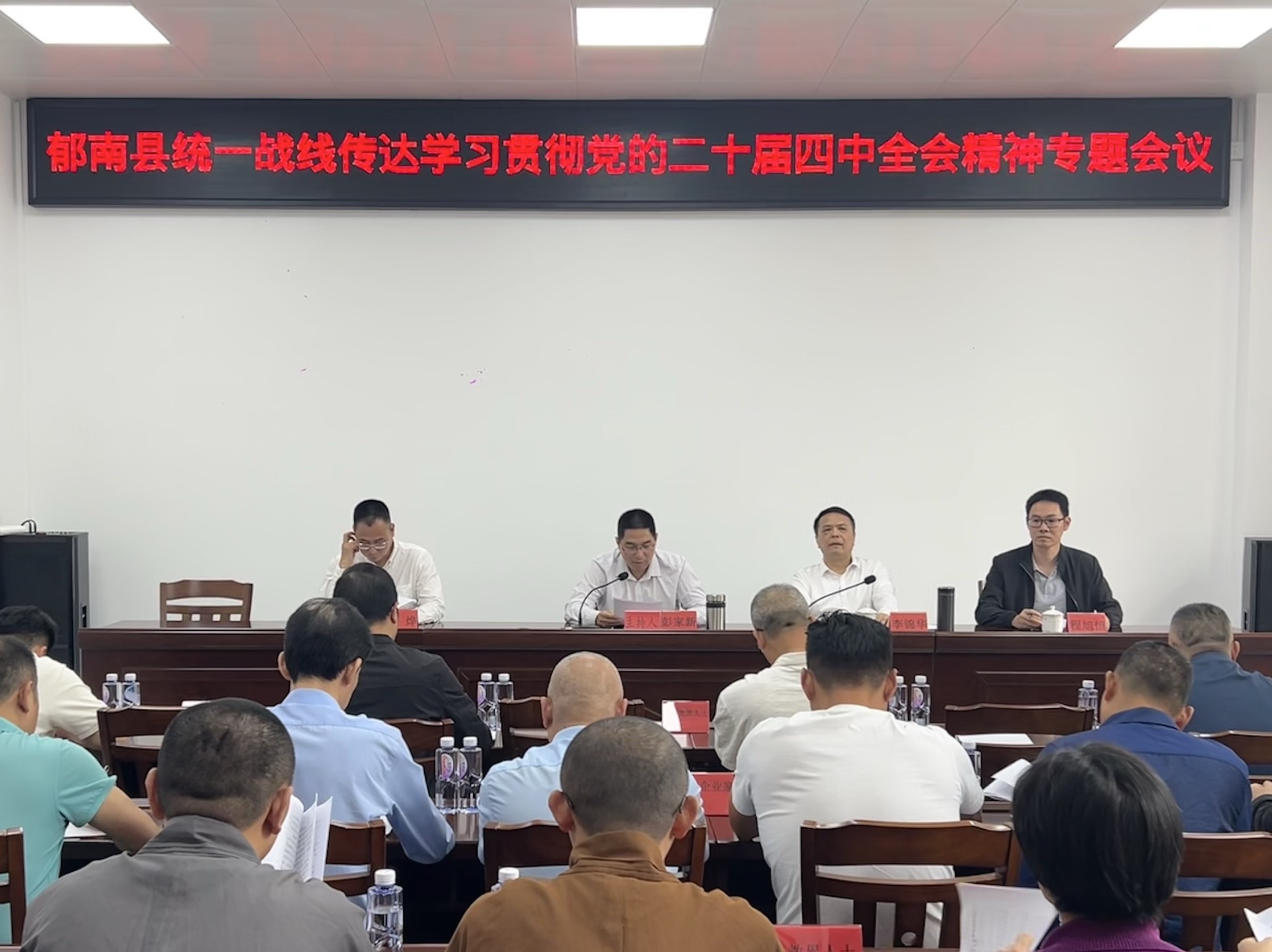 10月29日下午,郁南县委统战部召开全县统一战线传达学习贯彻党的二十届四中全会精神专题会议,会议认真传达学习党的二十届四中全会精神以及省、市、县传达学习贯彻党的二十届四中全会精神相关会议精神,深入领会核心要义,并系统部署了贯彻落实举措,引导全县统一战线成员把思想和行动统一到中央、省委、市委和县委的决策部署上来,为郁南县“十五五”时期高质量发展凝聚统战力量。县领导彭家新主持会议并作讲话。县委统战部、县工商联、县侨联全体领导干部,以及民主党派、无党派人士、民营企业、县新阶联和宗教界等各界代表共50多人参加会议。