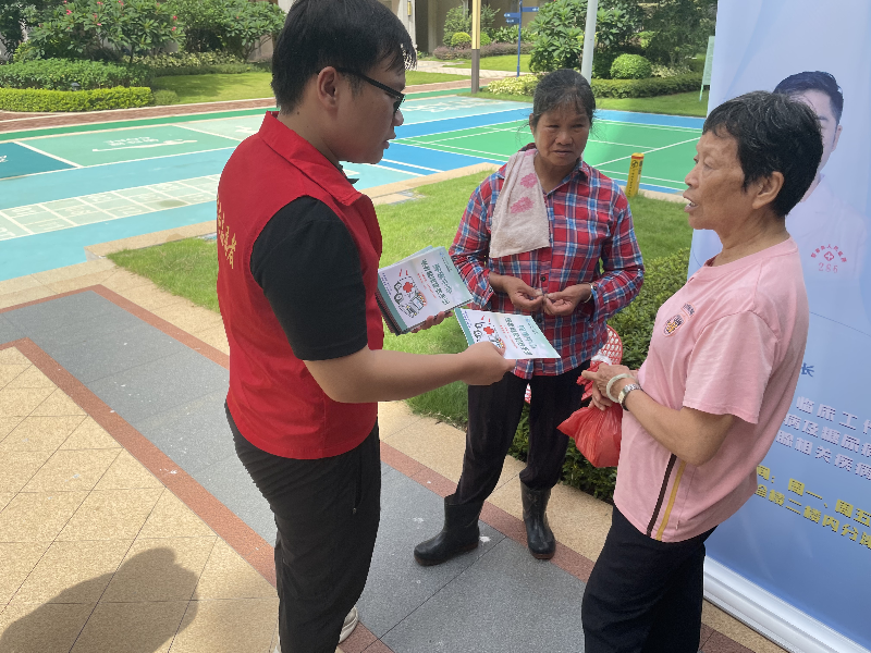 活动现场,社区志愿者通过派发健康知识宣传单,向居民进行简单的讲解,让居民把宣传单带回家中,把健康知识带回家中。