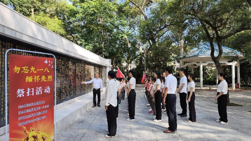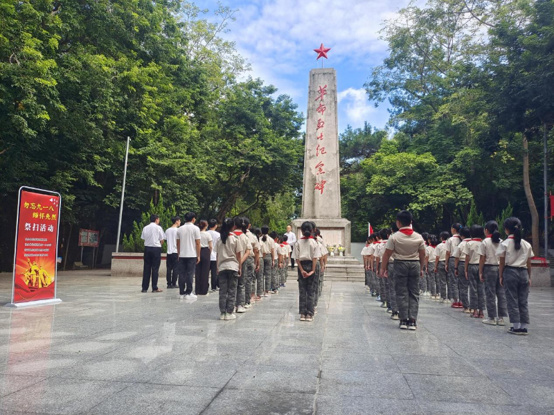 接着,学校的全体党员和教师代表、少先队员代表一行60多人来到郁南革命烈士陵园,举行“勿忘九一八  缅怀先烈〞祭扫活动。师生们先清扫了陵园周围的杂草、落叶,全体庄严肃穆,在纪念碑下齐唱国歌,向革命烈士敬献鲜花,默哀。