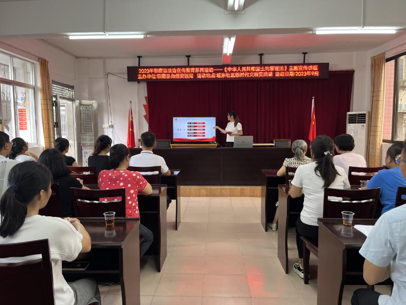 为进一步提高社区居民群众关注土地资源、保护耕地、节约用地的意识,增强群众的法治观念,9月26日,郁南县自然资源局在都城镇城东社区组织开展2023年郁南县法治宣传教育系列活动一一《中华人民共和国土地管理法》专题宣传讲座。