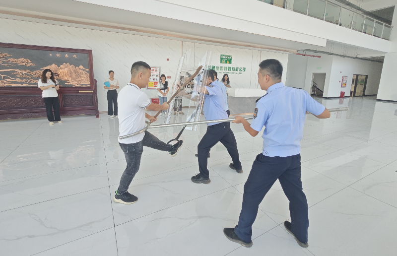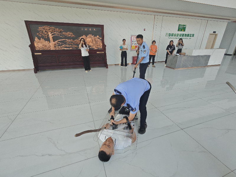 演练采用模拟场景的方式,模拟一名手持棍棒的暴徒冲进企业企图制造暴恐事件。企业正在正常运作时,突然有意图不轨的歹徒冲入企业,对员工和生产设备造成伤害。企业安保人员及时将情况上报并报警,同时全力阻止歹徒。大湾派出所接到报警后,迅速组织民警赶到现场,展开抓捕行动,与企业安保人员合力快速制服“歹徒”。