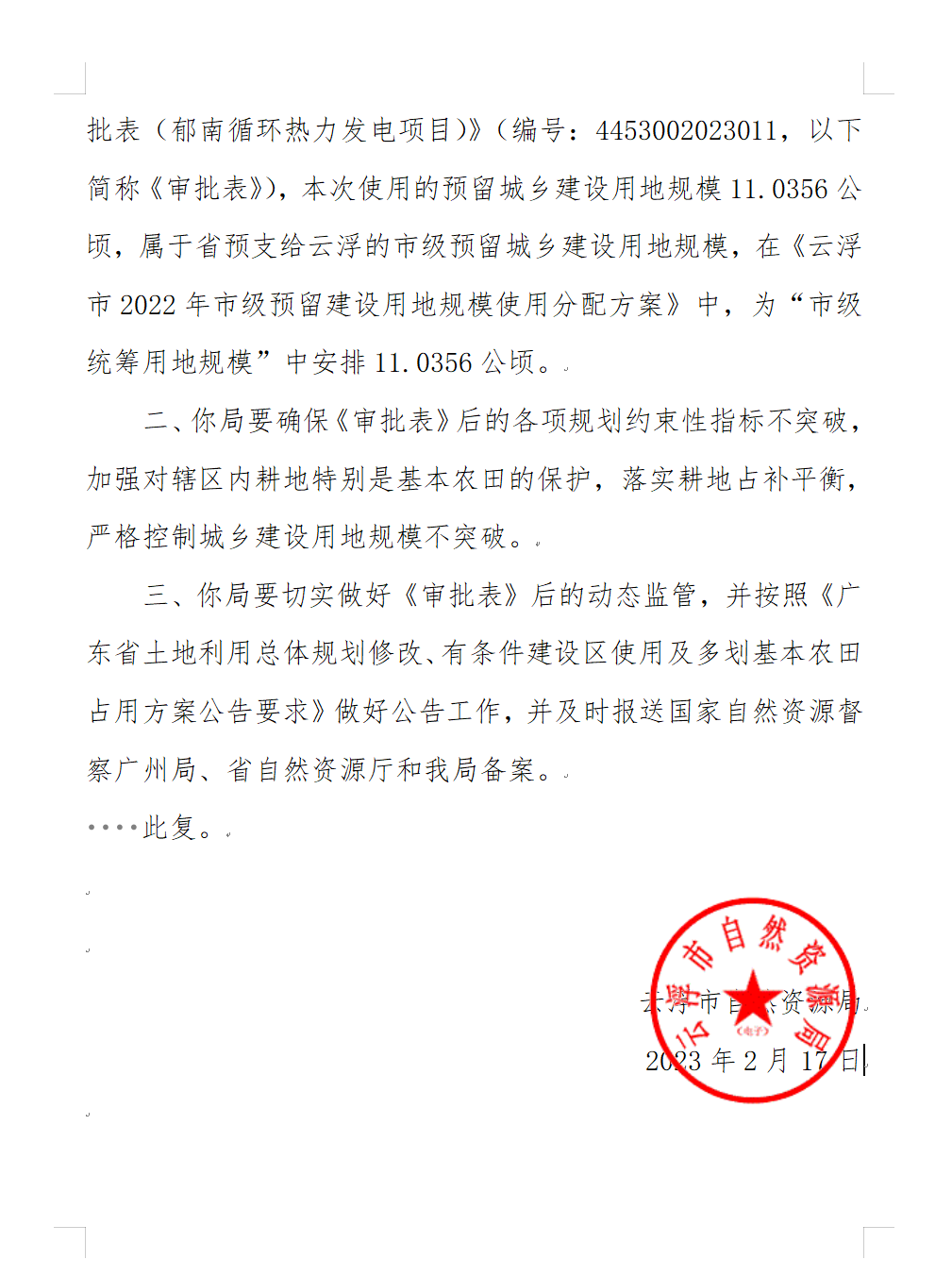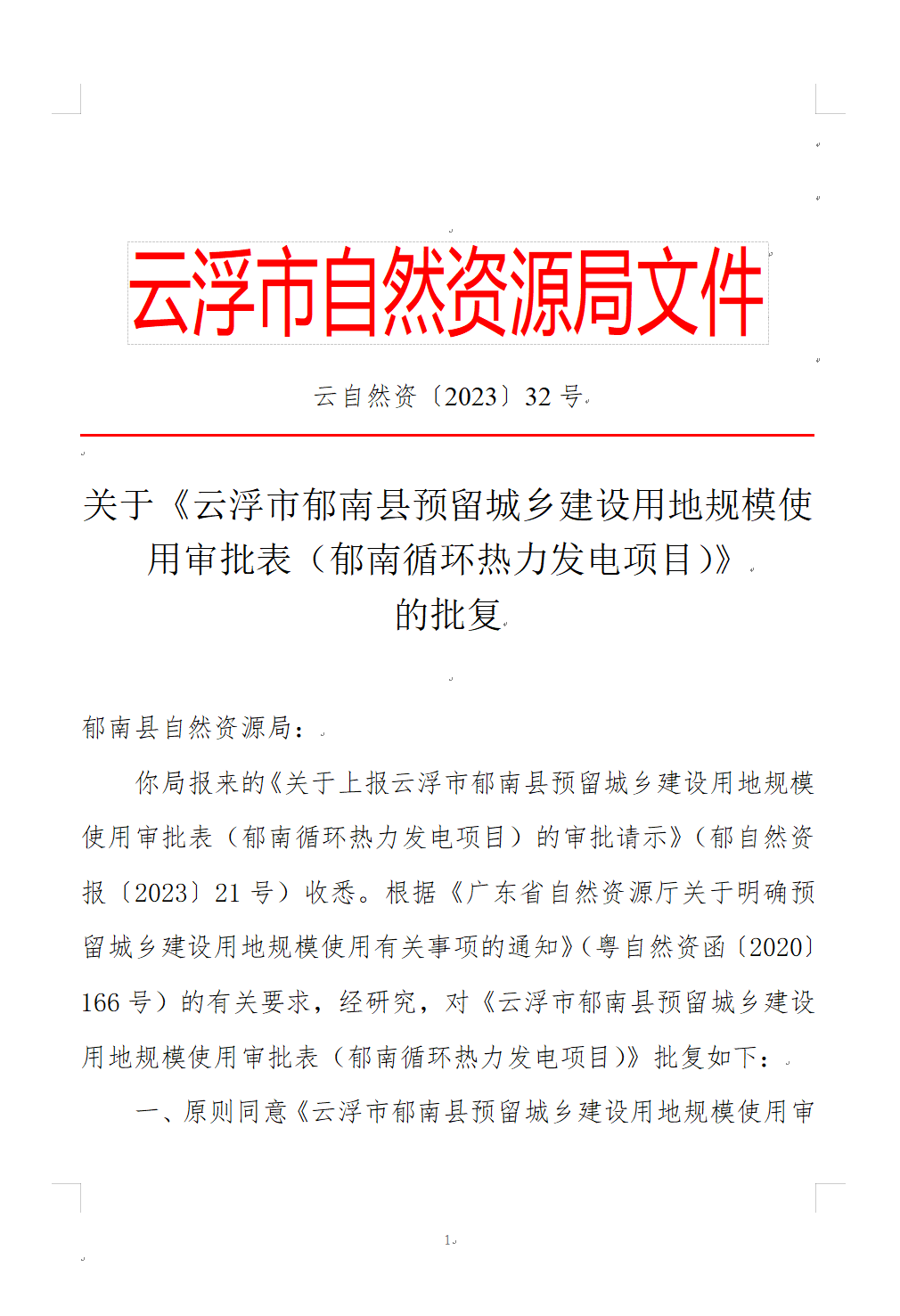 关于《云浮市郁南县预留城乡建设用地规模使用审批表(郁南循环热力发电项目)》的批复(云自然资〔2023〕32号)。