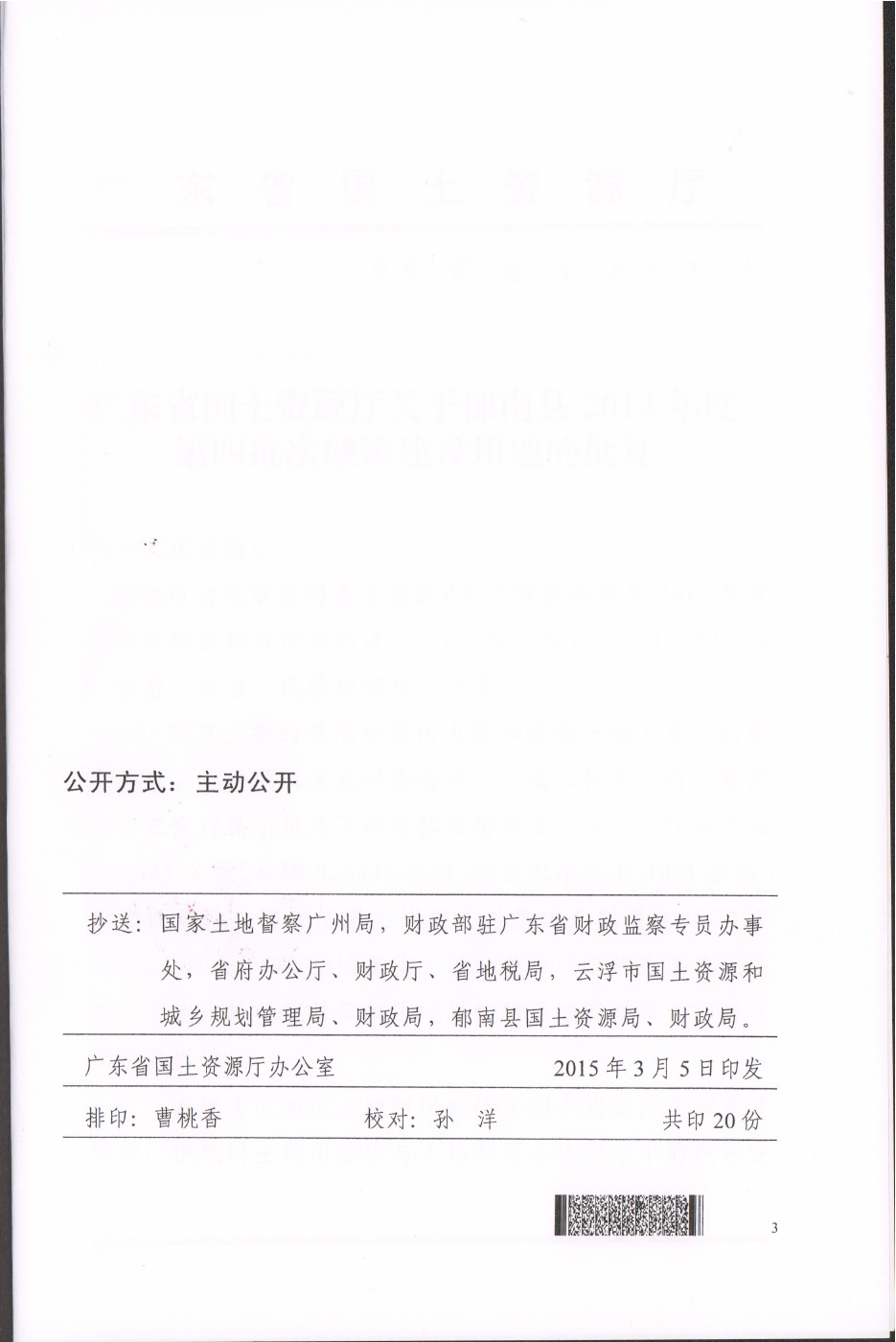 广东省国土资源厅关于郁南县2014年度第四批次城镇建设用地的批复