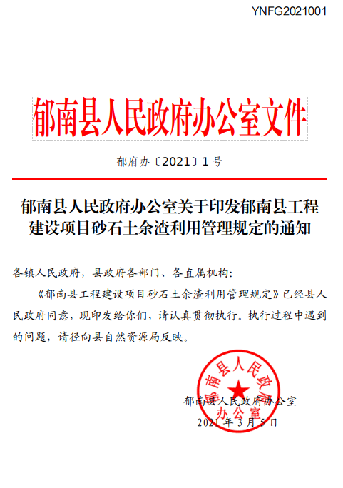 (YNFG2021001)郁南县人民政府办公室关于印发郁南县工程建设项目砂石土余渣利用管理规定的通知(郁府办〔2021〕1号)