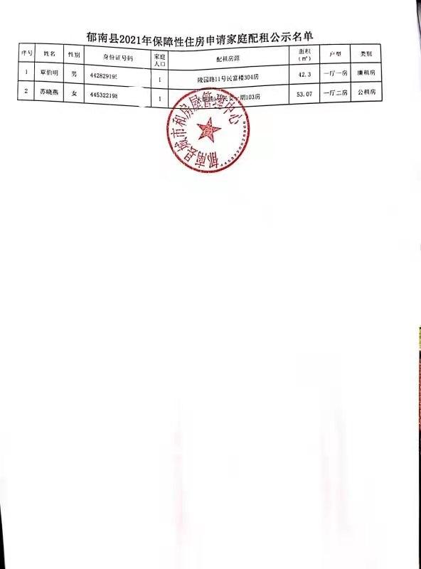 郁南县2021年保障性住房申请家庭配租公示名单