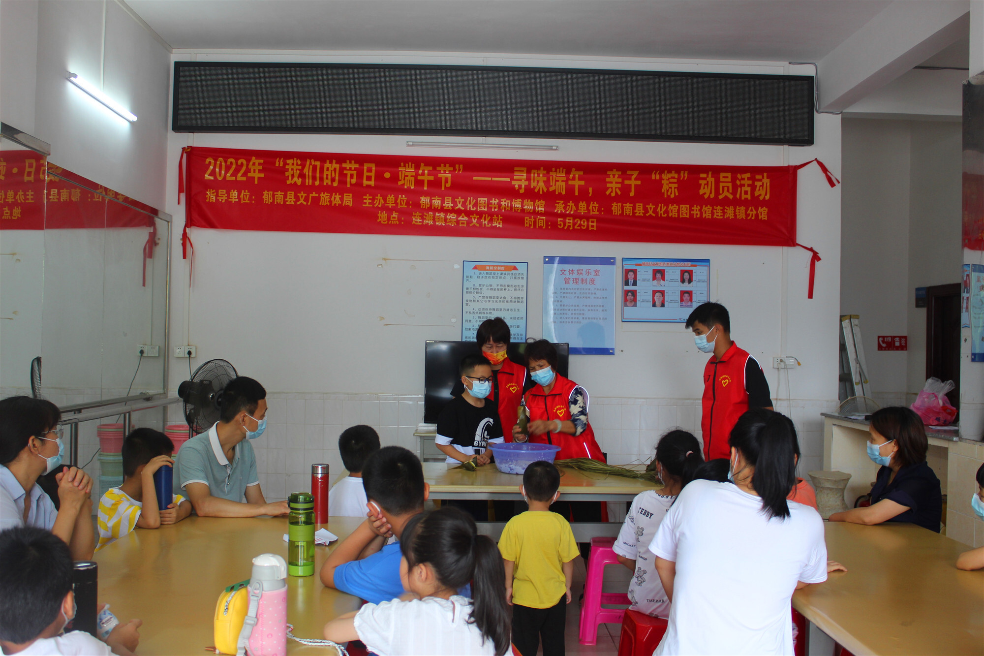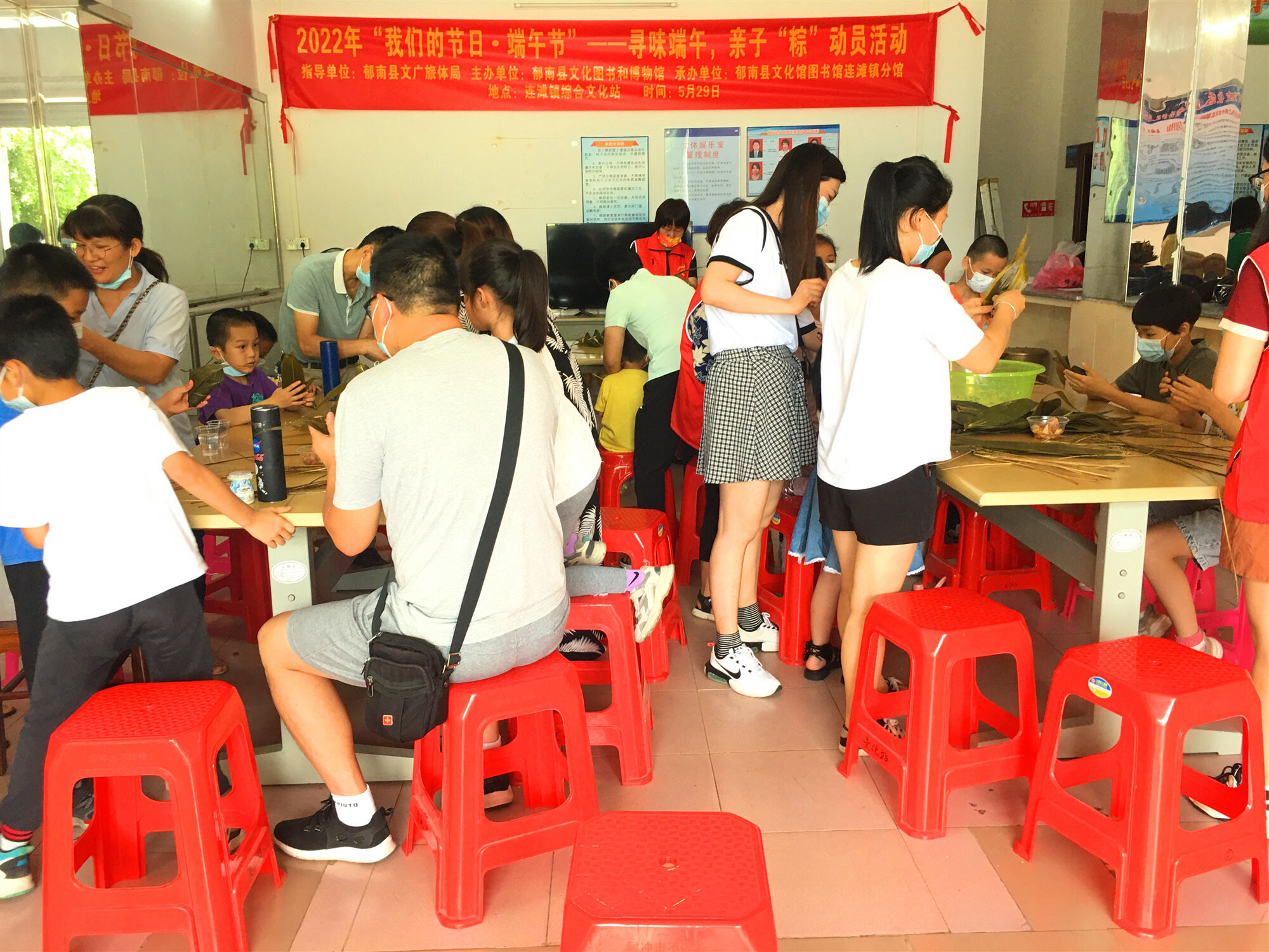 在端午节来临之际,为了营造浓郁的节日氛围,丰富广大群众精神文化生活,展示中国传统节日文化的内涵与精髓,近日,由县文广旅体局指导、县文化图书和博物馆主办、县文化馆图书馆连滩镇分馆承办,在郁南县连滩镇综合文化站举行2022年“我们的节日·端午”——情浓五月天,欢乐迎端午系列活动。