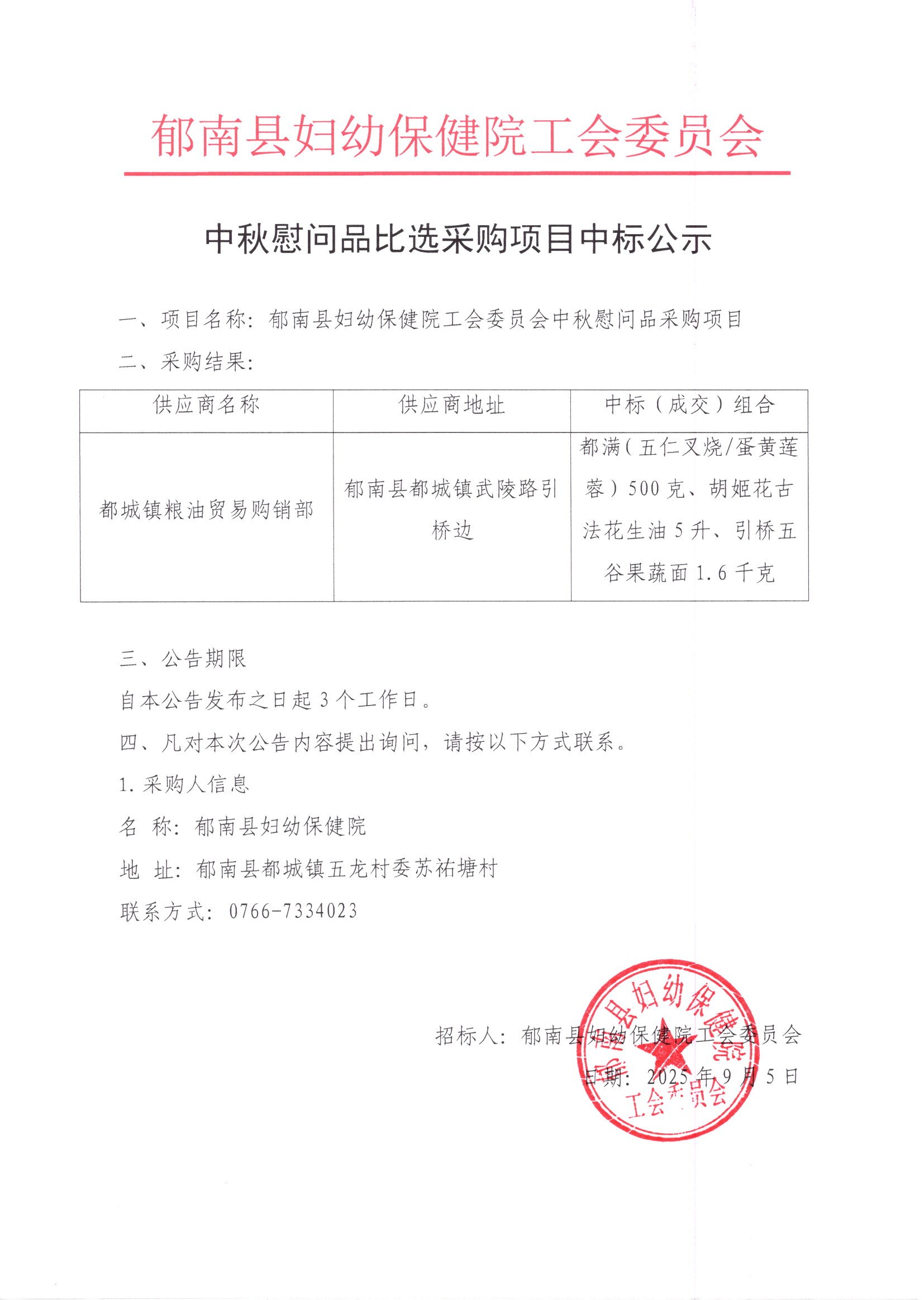 郁南县妇幼保健院工会委员会中秋慰问品采购项目中标公示
