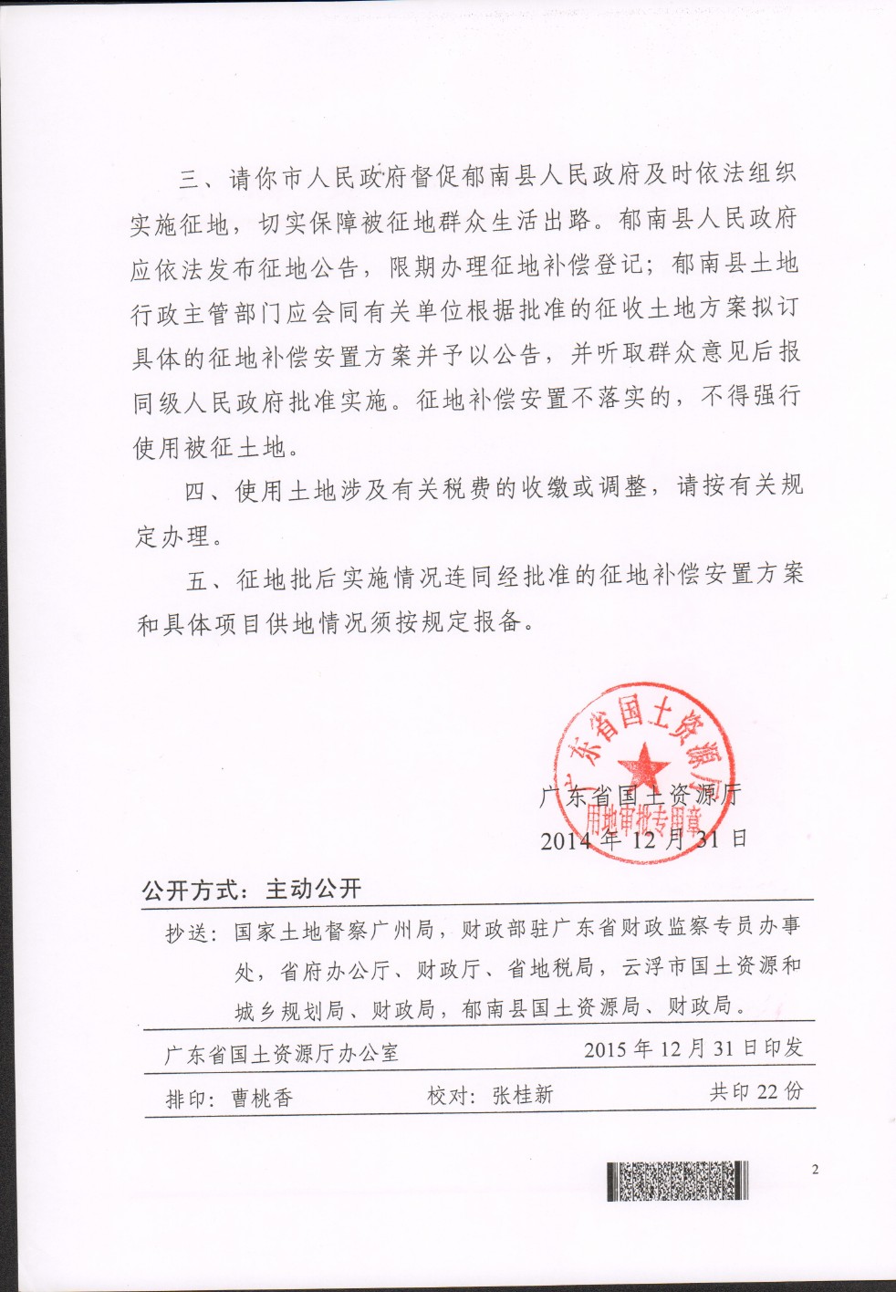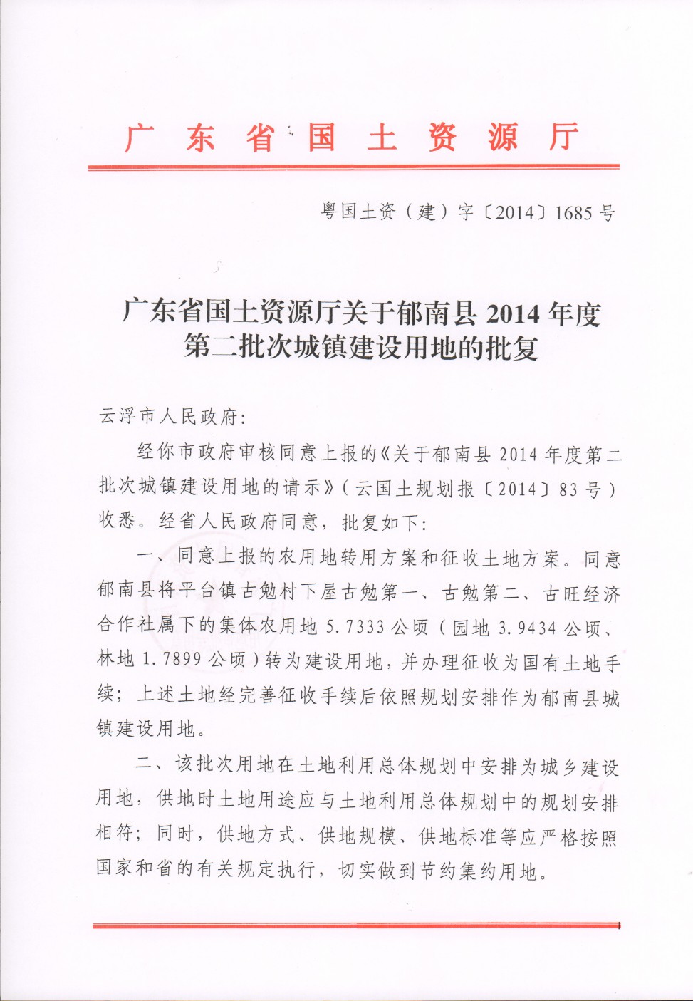 广东省国土资源厅关于郁南县2014年度第二批次城镇建设用地的批复