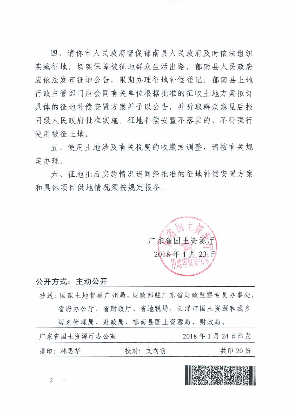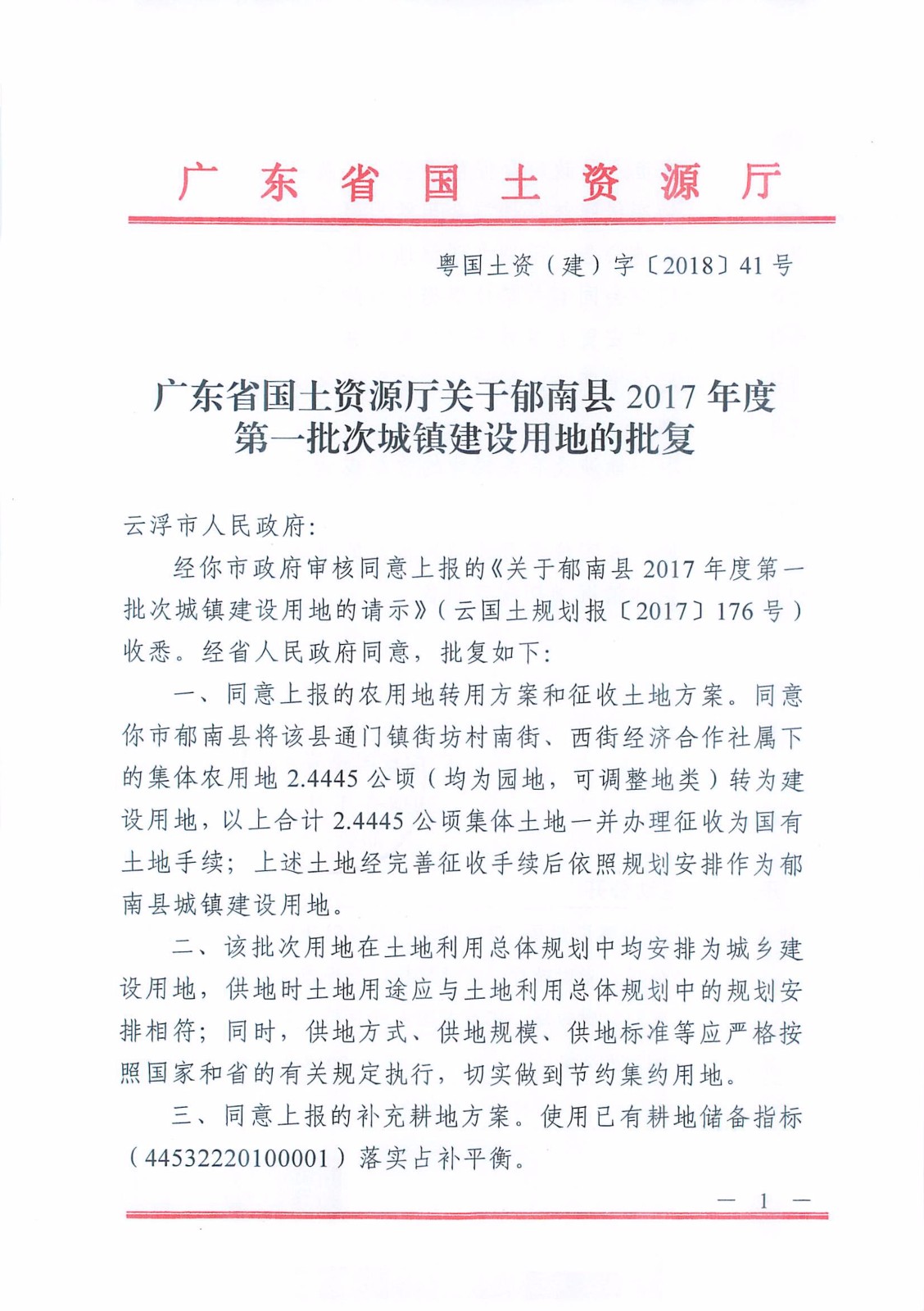 广东省国土资源厅关于郁南县2017年度第一批次城镇建设用地的批复